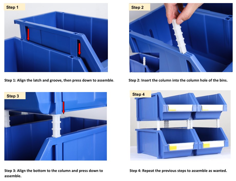 In a warehouse, simply place them on shelves to store and organize your parts and inventory.